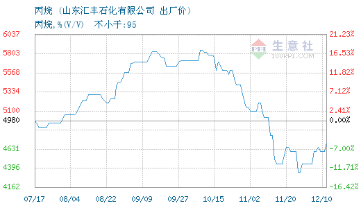 11月17日山东汇丰石化有限公司关于丙烷的报价为3850元/吨。丙烷的属性:丙烷,%(V/V) 不小于:95。该报价有效期为3天。