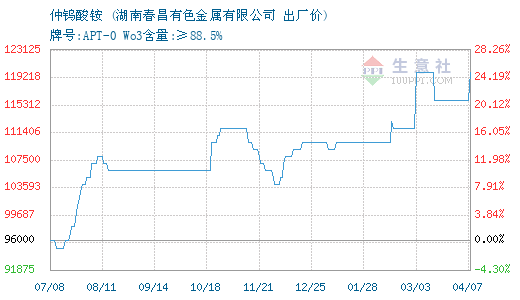 12月31日湖南春昌有色金属有限公司关于仲钨酸铵的报价为102000元/吨。仲钨酸铵的出产地为湖南;包装为普通。仲钨酸铵的属性:牌号:APT-0;Wo3含量:≥88.5%。该报价有效期为3天。